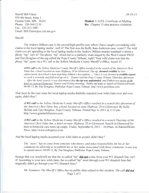 My last data request has forced Yellow Medicine County Sheriff Bill "Threat To Public Safety" Flaten to change his loony story in another high profile case, hasn't it? The first time was the Kelly Jean Andrew case, wasn't it? More on that later . . .